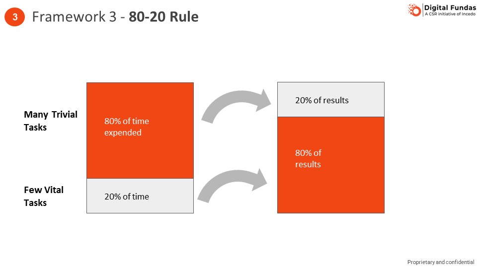 The Pareto principle, or the concept that a few vital tasks drive the majority of results, is a well-known concept. However, not many are able to apply it practically in their daily lives. The reason is, while the 80-20 principle is evident in hindsight, it is difficult to see it with foresight. To improve your 80-20 ability, it is important to make the time to think about it. This is easier said than done, as most of us are so caught up in the flow of routine events that we don’t make enough time to think through our options and approaches. In addition, it is imperative that we make time for reflection. Writing a diary can be very helpful. This practice of reflection can improve the intuition one requires to make the right 80-20 decisions.