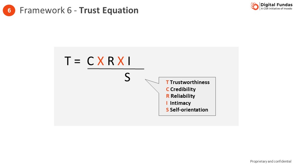 Trust is the foundation of relationships and a key to success, both in our personal and professional lives. It is like a super- powerful lubricant that makes interactions and working together easy and effective. Trust can take time to build. However, once you build trust in a relationship, it moves to a totally different level of effectiveness. Trust equation is a great framework to understand how to build trust. Your trustworthiness is driven by your credibility (expertise, knowledge), reliability (consistency of actions) and intimacy (personal connect). However, the most important driver is self-orientation in the denominator. All the great work resulting from the earlier three factors can be undone by a perception of self-centredness in you. Trust Equation is a good reflection of the human balance of head and heart. Credibility and reliability reflect the head, and intimacy and self-orientation the heart.
