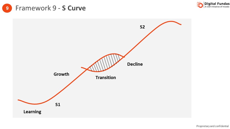 The Sigmoid curve (or the S Curve) is an extension of the learning curve where, after the growth phase, you see a period of maturation and then eventual decline. The S curve represents many business and life situations and has profound implications for both companies and individuals. To ensure sustained growth, you have to move from one S curve to another. The only option for shifting from one curve to another is when you are on your way up. This is because you can never predict the top, and when you are in the decline phase you lose energy. It may be that the first curve is longer than anticipated, in which case you can keep cruising along until you are indeed nearer to the peak. But preparing for the second curve too early is far better than waiting until it is too late, and decline has set in. However, making a shift when you are in a growth phase and things are going well is not easy. You have to break out of your comfort zone. Moreover, when you transition between S curves you will go through a period when the rewards are lower (as you have to battle through the learning phase of the next S curve). Successful individuals and organizations are self-reflective and constantly monitor their own positions on the S curve. Riding the first curve while cultivating the second is always the best option. Clinging to the first and trying to prolong it is a pointless waste of energy. When all is well and you are at the top of your game, then you know it is time to plan your next move. Clearly, being able to identify the nature of the S curve you are operating in, being able to transition from one S curve to the next and then stitch them together, would be key to continued growth.